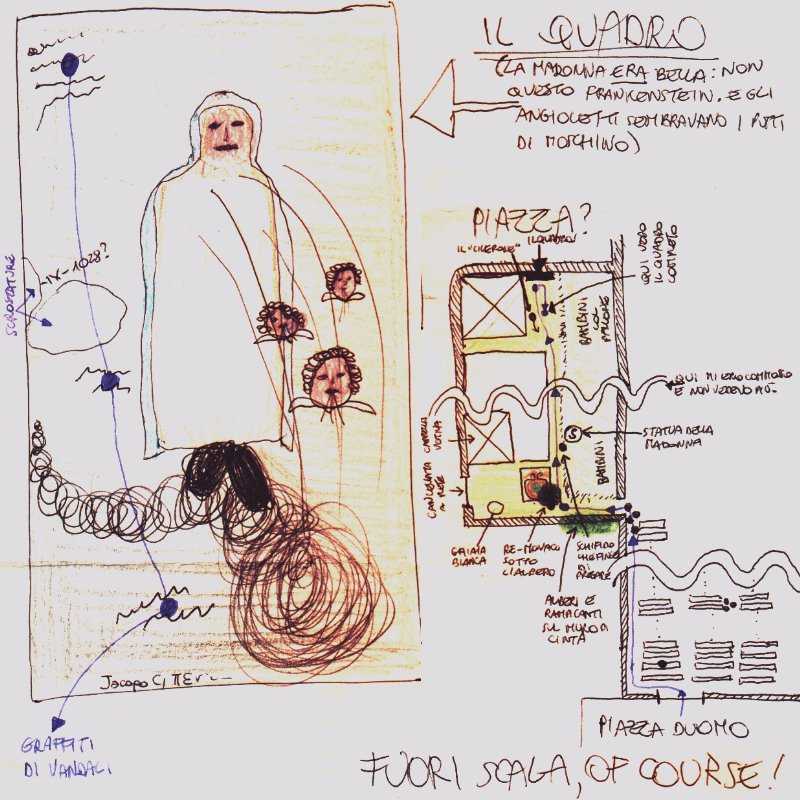 Le mie percezioni non mutavano neppure avvicinandomi, anzi trovavano conferma nell’aria sinistra che emanava dal losco figuro che se ne stava lì, appostato come un assassino, un subdolo sorriso tagliente sulle sue labbra, sipario di denti aguzzi e marci come marcia era l’anima che li digrignava. Passai oltre con passo maestoso e cadenzato: quel miserabile era lì per me, ma non osò (o non gli riuscì?) muoversi - non un singolo muscolo. E così, non potendosi addentrare oltre, fallita la sua missione di assassinarmi disparve. Quand’ecco.. Al mio risveglio, la mattina seguente, potevo ancòra assaporare gli strascichi della Beatitudine che mi aveva investito in quel preciso istante del sogno. ..riconobbi il luogo dove mi trovavo dal labirinto, il perché eterno dal dubbio perenne, e fu come se ogni essere inanimato che mi circondava mi avesse riconosciuto in un solo momento, e mi salutasse esultando. Scoppiai in lacrime di gioia, scosso com’ero forse traballai pure un poco, ma continuai a camminare senza neppure vedere dove stavo andando - e che importava? Stavo andando sicuramente nella direzione giusta. Subitanea com’era venuta, la Beatitudine disparve come una parentesi che si chiude: un Paradiso che ti dice "Arrivederci a presto" e taglia fuori la Luce dietro a una porta. Ma non me ne rammaricai, anzi: fui grato per quell’esperienza vivificante che mi era stata donata poco prima del raggiungimento della mia meta.. E in essa mi c’imbattei, quasi nel senso letterale della parola: era sbucato come dal nulla, come il muro per chi cammina a testa bassa, e mi sovrastava nella sua divina imponenza. Tuttavia non la temevo, come invece Mosè temeva la colonna di fuoco. Ne ero affascinato, questo sì. Incuriosito, ma con quel certo distacco che traspare da un esperto d’arte davanti al quadro di un autore famoso: la si potrebbe definire "una sacrale ammirazione". Già. Perché, come mi accorsi sùbito dopo aver fatto un passo indietro per osservarlo nella sua totalità, non si trattava di una statua della Madonna, ma di un quadro. Dipinto, credo a olio, su un pannello di legno liscio, un legno povero, poco meno grezzo del compensato, dello spessore di neanche un centimetro, appeso a circa un metro da terra sul muro di cinta del chiostro, là dove il muro di cinta si riuniva alla chiesa che lo generava come in un "materno" abbraccio protettivo. Un dipinto antico, senza ombra di dubbio. A fatica ne decifravo la data, scritta stranamente in grande, e pure un poco storta, a sinistra del centro del quadro: "anno 1028?" - proprio col punto di domanda. Quanto al giorno e al mese, erano illeggibili: i secoli avevano scrostato un po’ di vernice, e vandali avevano deturpato con le loro piccole scemenze una grande opera d’arte. Un quadro strano: raffigurava a tinte scure, direi quasi lugubri, una Madonna sospesa su sfondo nero, che sotto ai suoi piedi schiacciava una massa informe - intenzionalmente dipinta con un ghirigoro infantile: una specie di turbine, proprio come i bambini disegnano i capelli ricci, oppure il fumo che esce dai comignoli. Cercai una targhetta con il titolo del quadro. Perlomeno, una che recasse il nome dell’autore. Stava scritto dalla stessa pennellata della mano che aveva apposto la data in fondo al quadro, un quasi invisibile nero su sfondo nero: "Jacopo" e poi qualcosa che sembrava una traslitterazione in greco antico del cognome. Dissi a me stesso un rabdomantico "E te pareva!" al pensiero che, come sempre nella mia vita, le "coincidenze" si sprechino.. Quand’ecco apparire alle mie spalle una famigliola di turisti con le macchine fotografiche a tracolla, pantaloncini corti, espadrillas colorate e il ridicolo cappellino "da pescatore all’alba". Forse tedeschi accompagnati da un loro amico italiano che gli faceva da cicerone. Bene, costui mi scansò alquanto irrispettosamente con una spallata, e recitò il suo disco: