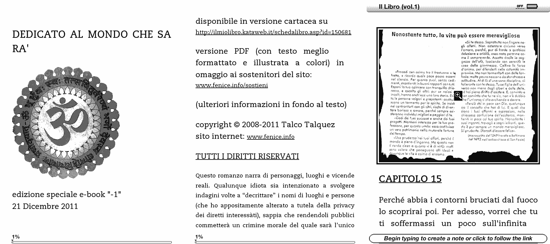 Per festeggiare entrambe le ricorrenze, e il quarto compleanno del Libro, ho deciso di rilasciare questa "versione shareware" dell'intera trilogia: la scarichi gratis e puoi (anzi: DEVI! ;-) diffonderla liberamente, inviando per email lo ZIP (o il link www.fenice.info/ebook) oppure anche tramite il volantino (non dico distribuirlo per strada, ma potresti ad esempio appenderlo in biblioteca).