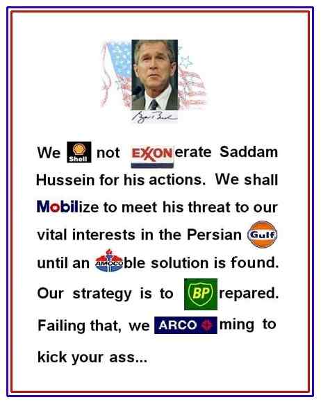 «Non intendiamo esonerare Saddam Hussein dalle sue azioni. Ci mobiliteremo per far fronte alla minaccia che lui rappresenta per i nostri interessi vitali nel Golfo Persico, fino a che troveremo una soluzione amichevole. La nostra strategia è di essere pronti. In caso contrario, veniamo a farvi un culo così..»