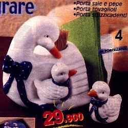 Papera "menage" L.29.900 (€15,44) Una simpatica famiglia di paperette per rallegrare la vostra tavola. "Mamma papera" è un originale portatovaglioli e portastuzzicadenti (cm 20x11x14,5 h). Sotto le sue ali "protegge" due piccoli "paperotti" portasale e portapepe (cm 7x4x6h ciascuno). Realizzati in porcellana decorata. |