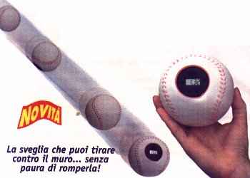 LA SVEGLIA PALLA DA BASEBALL! - la sveglia che puoi tirare contro il muro.. senza paura di romperla! €12,90 Davvero simpatica la palla-da-baseball-sveglia! Appoggiata sul mobile sembra una vera palla, poi la giri e leggi l'ora. Ma la cosa più divertente è che quando suona la sveglia, la puoi fermare 'scuotendola' o lanciandola, non troppo forte, ovviamente! Diametro circa cm10. Funziona con una batteria bottone, compresa. Commento: poterla lanciare "ma non troppo forte" è anche peggio di un coitus interruptus.. quando sei libero ma non troppo, non sei libero ma doppiamente prigioniero. |