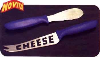 I COLTELLI PER I FORMAGGI €5,90 Simpaticissimi con i loro manici blu, questo set comprende un coltello seghettato con la scritta CHEESE (formaggio) e la punta biforcuta, fatta apposta per infilzare il pezzettino di formaggio appena tagliato! L'altro coltello è invece per il burro ed i formaggi morbidi. Saranno bellissimi sul tagliere dei formaggi! Lunghezza cm 21 lo spalmaburro e cm24 l'altro. Commento: idem come sopra. |