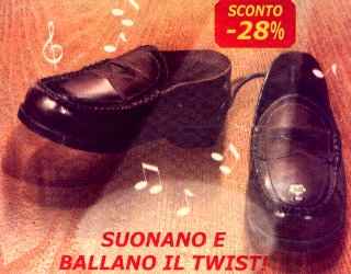 Le scarpe che ballano il twist.. da sole! - mocassini "twist", €34,90 (scontato: €25,00) Stupisci amici e parenti con questo incredibile gadget: si muovono in qua e in là ballando sulla musica di uno scatenato twist! Simpaticissimi per.. movimentare una serata troppo tranquilla! Le scarpe funzionano con 4 batterie mezza torcia, non comprese. Si attivano con il sensore di movimento oppure premendo un tasto. Misure di ogni scarpa: cm 26,5 lunghezza x 9 x 7,5. Non possono essere indossate. Commento: se davvero servono per movimentare una serata troppo tranquilla, sono il gradino immediatamente precedente a un revolver per fare la roulette rossa. (Prego notare che specificano che non vanno indossate.. casomai qualcuno credesse di usarle per imparare a ballare! :-) |