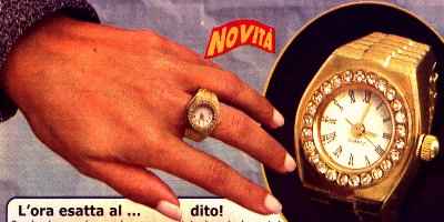 L'ora esatta al.. dito! - anello con orologio, €29,90 Per la donna che vuole essere originale ed elegante! Questo bellissimo anello a fascia è elasticizzato per adattarsi ad ogni misura di dito. In acciaio inossidabile dorato, quadrante con brillantini, numeri romani, lancetta dei secondi, movimento al quarzo. Batteria a bottone compresa. Diametro circa 15mm. Davvero un bel regalo! Commento: "davvero un bel regalo!", da urlo, proprio! Se già hai lo sveglione al collo, non puoi fare a meno di fare pendant col cipollone al dito. E chissà quanto ti sviluppa i muscoli delle mani, specie se lo indossi mentre lavori al computer! Eppoi vuoi mettere la comodità? Quando un seccatore ti chiede che ora è, lo mandi affanculo facendogli il noto gestaccio col dito. (Anche la signorina della foto lo indossa sul medio.) |