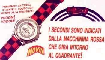 Orologio "Formula Sport" €39,90 Premendo un tasto, si sente il rombo dei motori alla partenza! VROOM! VROOM! I secondi sono indicati dalla macchinina rossa che gira intorno al quadrante! L'orologio per i tifosi della Ferrari e della Formula Uno! Ma non solo: premendo il tasto in alto a destra, si sente il rombo dei motori alla partenza! Un effetto davvero incredibile! Cassa in acciaio, lancette dei minuti e numeri fosforescenti, diametro cassa mm40, cinturino "bandiera a scacchi" rosso e nero in materiale tecnico. Movimento al quarzo, batteria a bottone compresa. Commento: sarebbe già triste se fosse per un bambino, ma vedere un adulto pigiare il bottone per sentire VRUM! VRUM! mi pare assai deprimente, no "un effetto davvero incredibile, punto esclamativo"; e c'è pure la "macchinina rossa che gira" :-p Appurato che l'acquirente-tipo di questo oggettino è un ritardato mentale, resta da appurare che cosa cazzo sia il "materiale tecnico" del cinturino. (Si vede che chi ha scritto la presentazione era a corto di parole.. E come dargli torto?) |