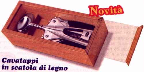 Cavatappi in scatola di legno (€29) Una bella confezione per un oggetto ancora più bello! Un robustissimo cavatappi in acciaio inox con manici rivestiti in gomma antiscivolo, alto ben 19 cm! La scatola che lo contiene è in legno chiaro con coperchio scorrevole trasparente e misura cm 21,5 x 9,5 x 6,5 Commento: come se fosse normale pagare un cavatappi 60 sacchi; come se fosse normale che sia il contenitore a nobilitare il contenuto anzichè un più logico viceversa. |