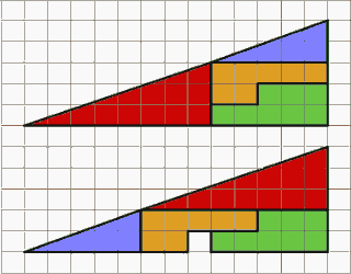Smontando questo triangolo di 13x5 in quattro pezzi, e ricomponendoli in diverso ordine, se ne ricava un triangolo uguale al precedente - ma in cui compare un quadratino di spazio in più!